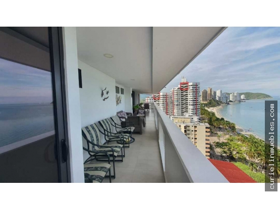 Amplio y remodelado apartamento duplex en piso 17 de 260m2 con permiso turístico en primera linea de mar, el rodadero, distribuido así: PRIMER PISO: sala, comedor, estudio, cocina integral, cuarto de servicio con baño, baño social, 3 alcobas con su respectivos baños completos, amplia terraza con vista frontal al mar. SEGUNDO PISO: 1 alcoba con baño interno, zona de labores. Se entrega con cortinas y ventiladores, toda la ventaneria tiene pelicula de refracción alemana que lo protege del sol, tiene parqueadero de uso común, cuenta con 2 depósitos dentro del apto, apto atractivo por su excelente ubicación, el edificio tiene planta eléctrica para las áreas comunes y ascensor, muy buena inversión para rentar por dias y para el disfrute familiar, se escucha oferta.